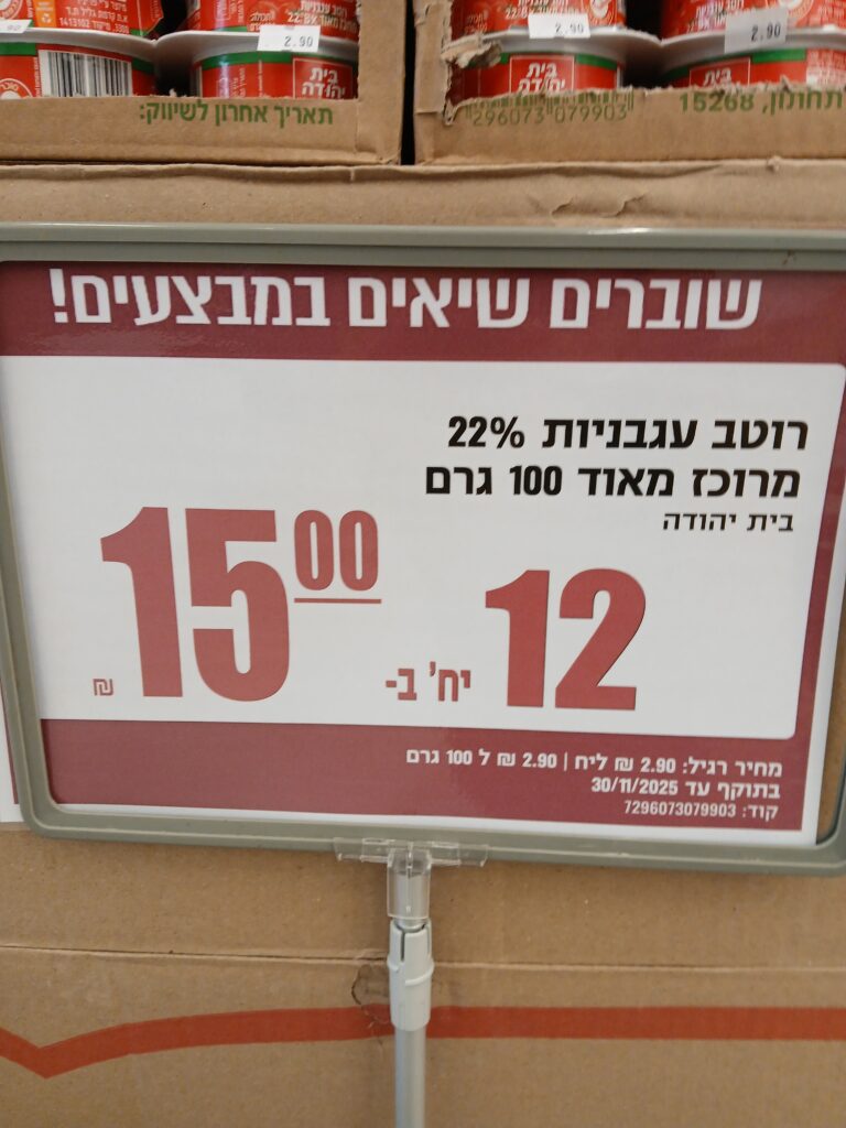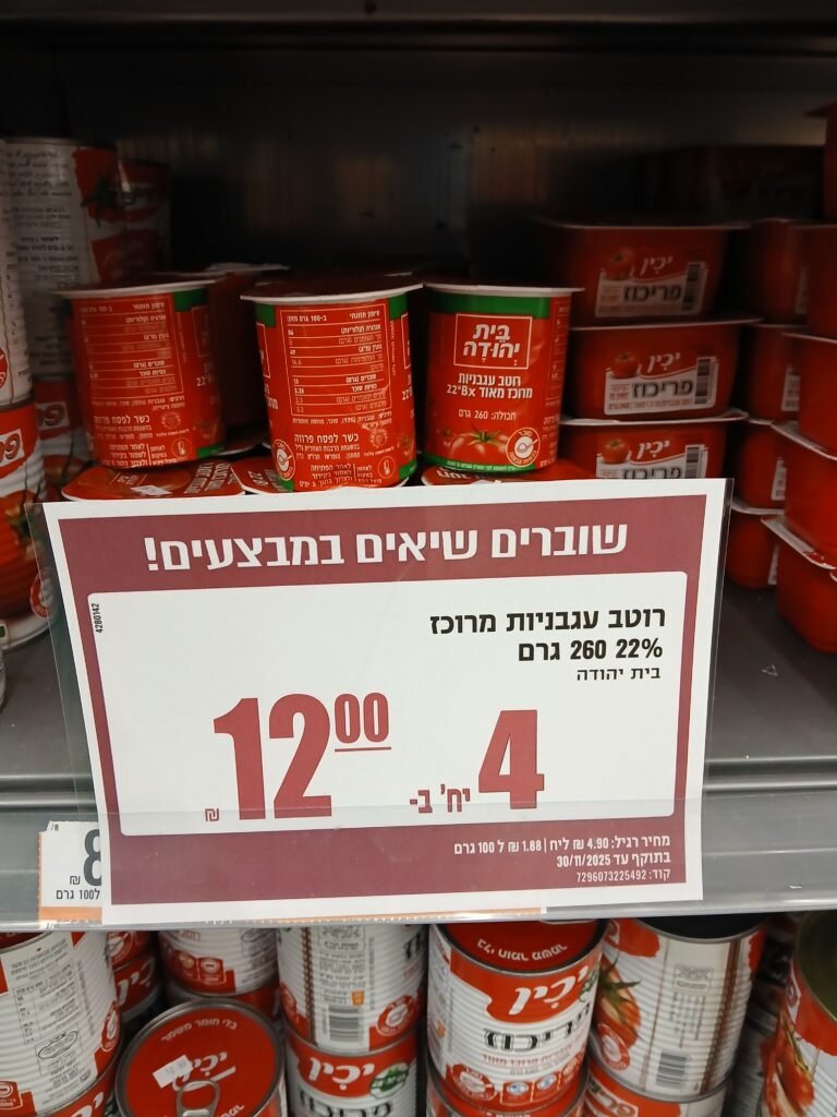 Above is a 260 gram package of tomato paste; it’s usual price is 4.90 each/1.88 per 100 grams (again, listed on the first line in the dark red below). So right away you can see that for 3 shekels a container, that’s a nice savings from the usual 4.90 price.