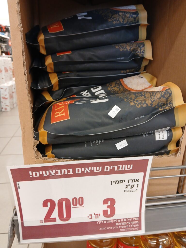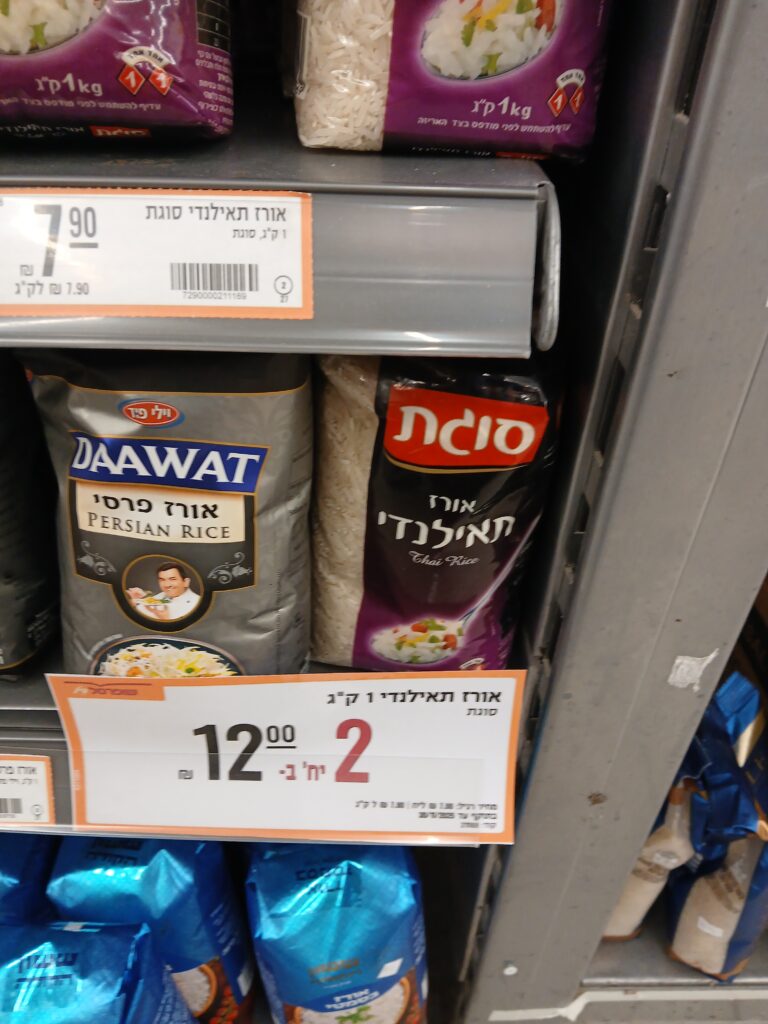 However, there’s another rice also on sale: Thailand rice. The usual price is 7.90, and the sale price is 2 kilos for 12 shekels, so 6 shekels a kilo.