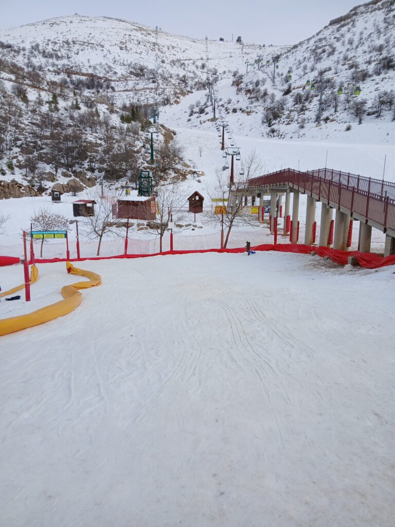 After sledding down the slopes, everyone walks back up between the designated yellow dividers. Here’s my husband heading up with ds9.
